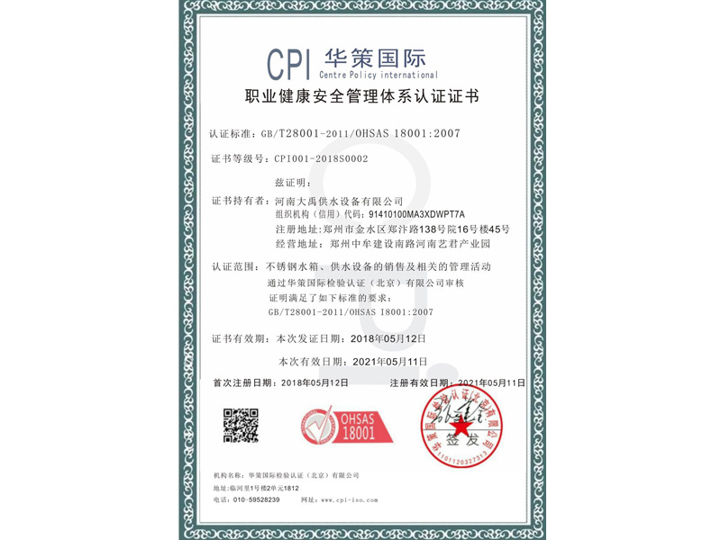 職業(yè)健康安全管理體系認(rèn)證證書