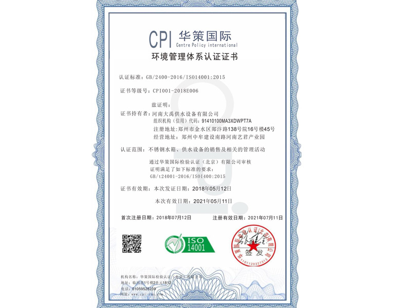 環(huán)境管理體系認(rèn)證證書